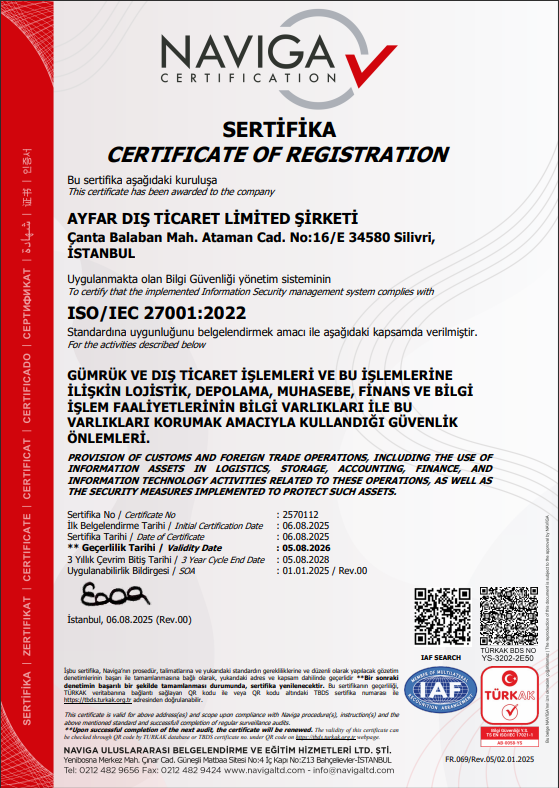 Ayfar Otomotiv, bilgi güvenliğini en üst düzeyde sağlamak amacıyla ISO/IEC 27001 Bilgi Güvenliği Yönetim Sistemi Sertifikasına sahiptir. Bu sertifika; bilgi varlıklarımızın gizlilik, bütünlük ve erişilebilirliğinin uluslararası standartlara uygun şekilde yönetildiğini göstermektedir.