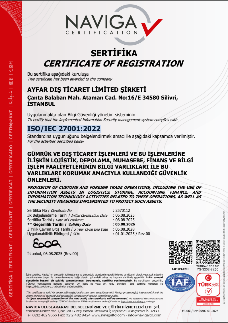 Firmamız, bilgi güvenliği alanında en yüksek standartları sağlamak amacıyla ISO/IEC 27001:2022 Bilgi Güvenliği Yönetim Sistemi uygulamalarını benimsemiş olup, 2023 yılı içerisinde yönetim sistemimizin güncel versiyonu olan ISO/IEC 27001:2022 belgesini, uluslararası alanda saygın belgelendirme kuruluşlarından biri olan URS (United Registrar of Systems) firmasından almaya hak kazanmıştır.